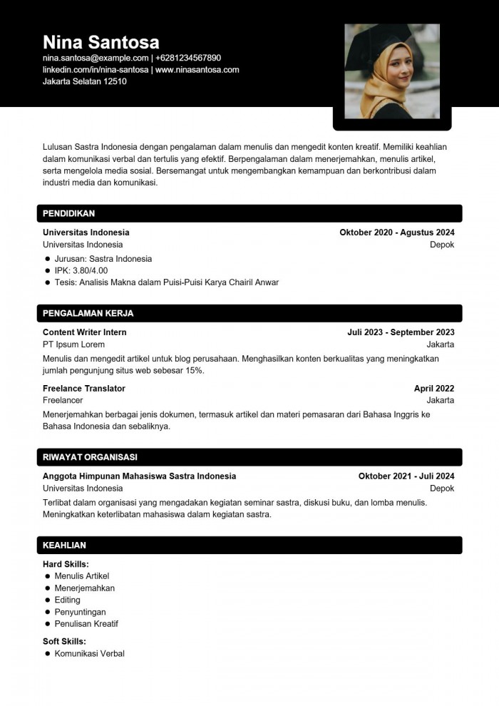 Contoh CV s1 Lulusan Sastra Indonesia dengan pengalaman dalam menulis dan mengedit konten kreatif.